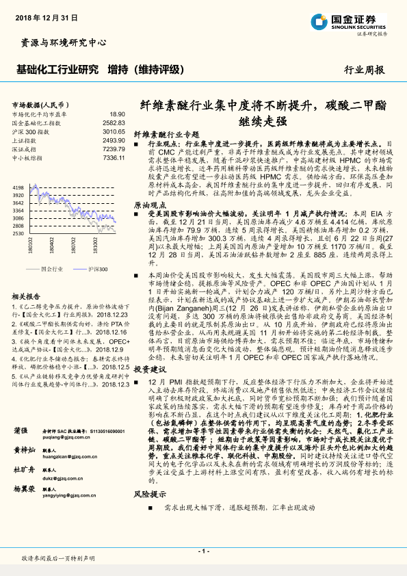 【国金证券】【20181231】基础化工行业周报:纤维素醚行业集中度将不断提升,碳酸二甲酯继续走强-34页