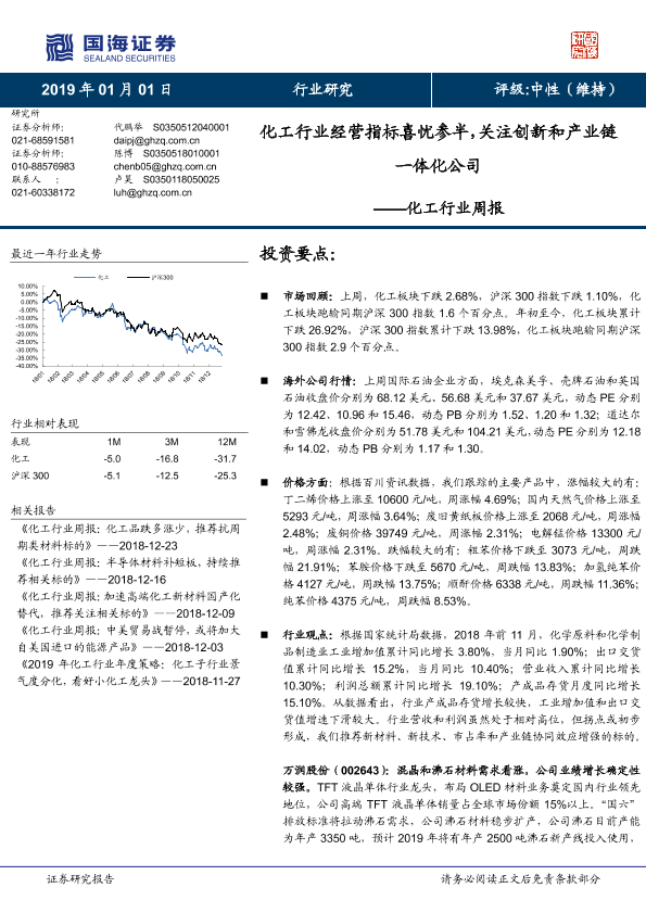【国海证券】【20190101】20190101-国海证券-化工行业周报:化工行业经营指标喜忧参半,关注创新和产业链一体化公司-31页