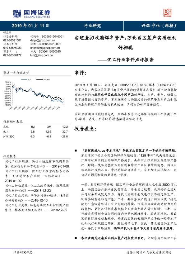 【国海证券】【20190111】化工行业事件点评报告:安道麦拟收购辉丰资产,苏北园区复产实质性利好初现-4页