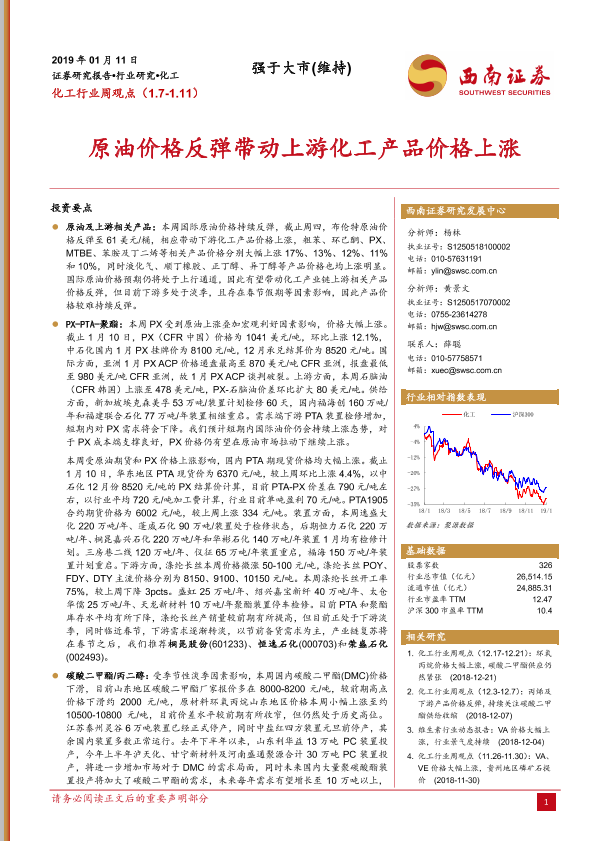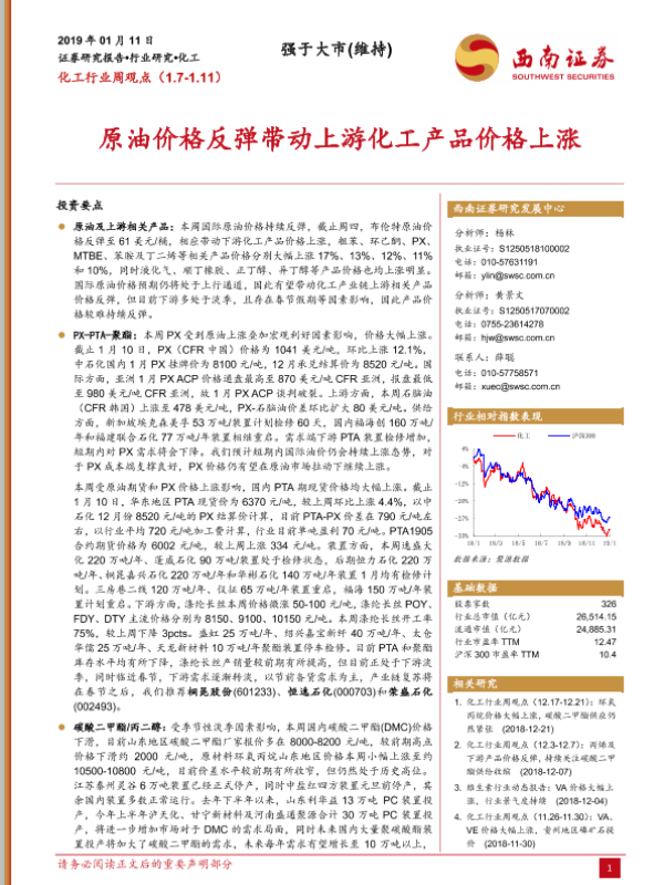 【西南证券】【20190111】化工行业周观点:原油价格反弹带动上游化工产品价格上涨-4页