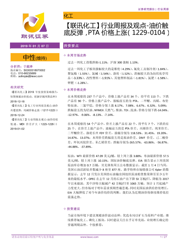 【粤开证券】【20190107】【联讯化工】行业周报及观点-油价触底反弹,PTA价格上涨-27页