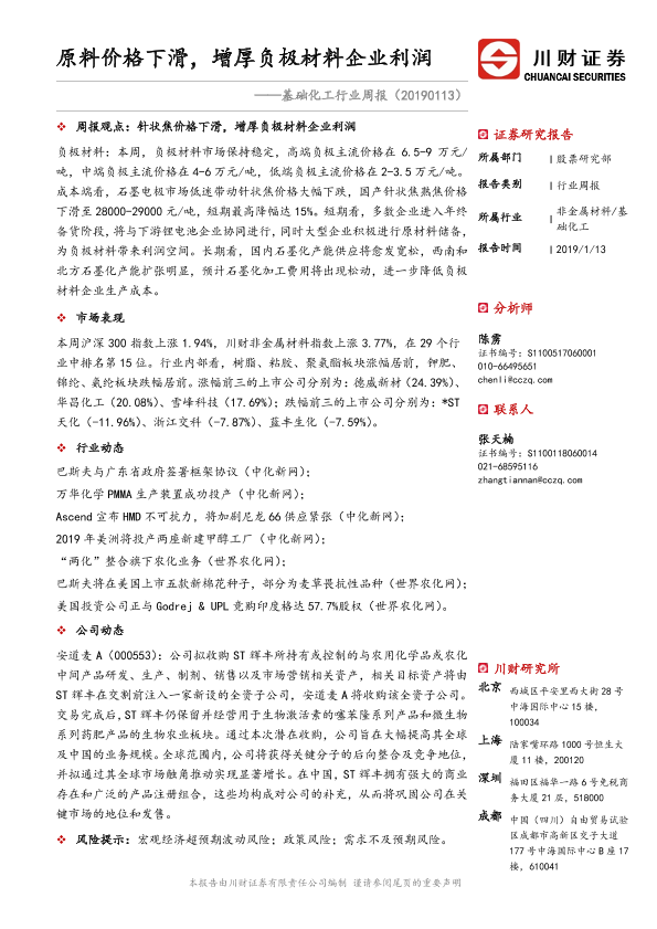 【川财证券】【20190113】基础化工行业周报:原料价格下滑,增厚负极材料企业利润-21页