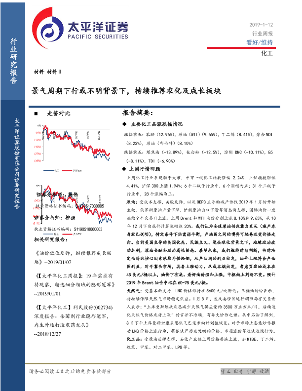 【太平洋证券】【20190112】20190112-太平洋-化工行业周报:景气周期下行或不明背景下,持续推荐农化及成长板块-39页
