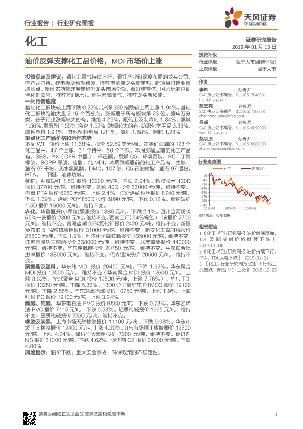 【天风证券】【20190113】20190113-天风证券-化工行业研究周报:油价反弹支撑化工品价格,MDI市场价上涨-18页