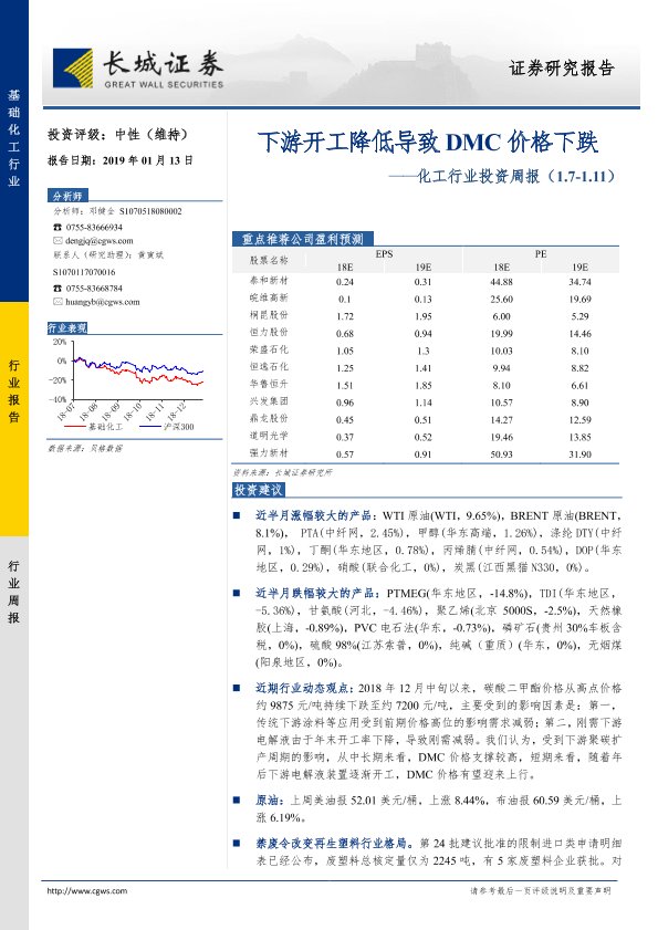 【长城证券】【20190113】20190113-长城证券-化工行业投资周报:下游开工降低导致DMC价格下跌-38页