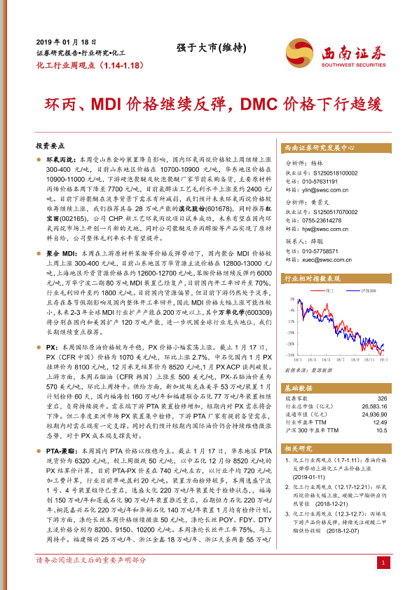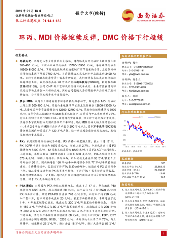 【西南证券】【20190118】20190118-西南证券-化工行业周观点:环丙、MDI价格继续反弹,DMC价格下行趋缓-4页