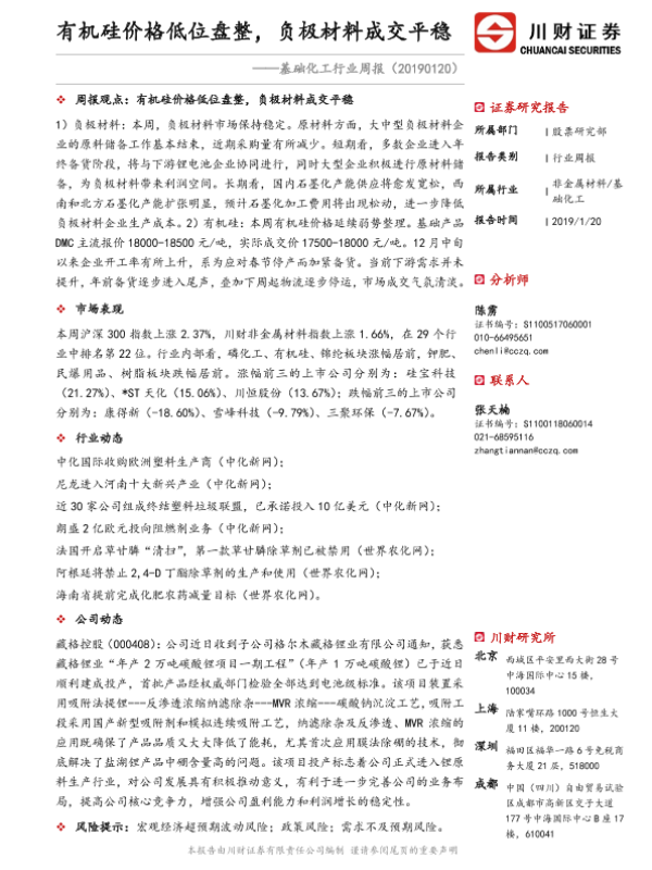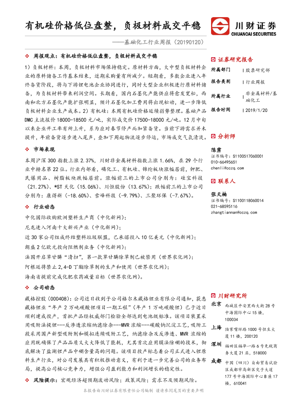 【川财证券】【20190120】基础化工行业周报:有机硅价格低位盘整,负极材料成交平稳-21页
