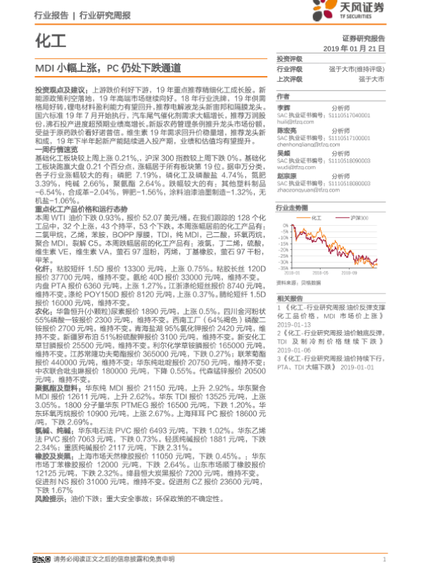 【天风证券】【20190121】20190121-天风证券-化工行业研究周报:MDI小幅上涨,PC仍处下跌通道-18页