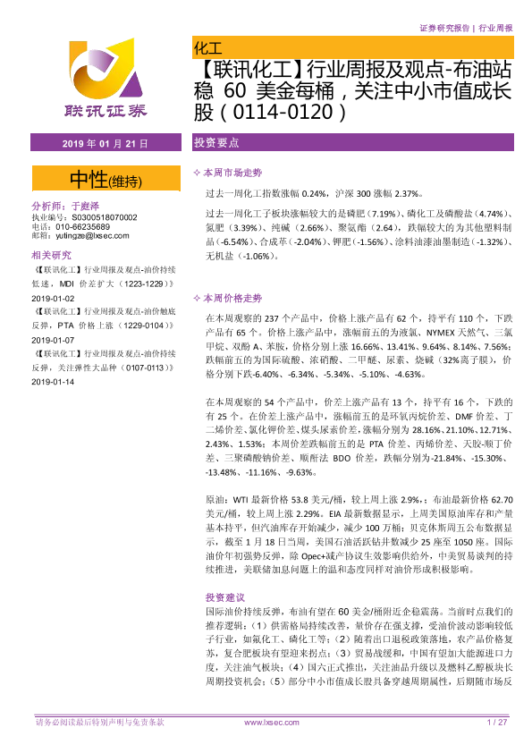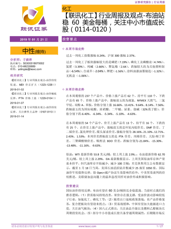 中小市值成长股 化工行业 市场价格走势 投资建议 油价分析
