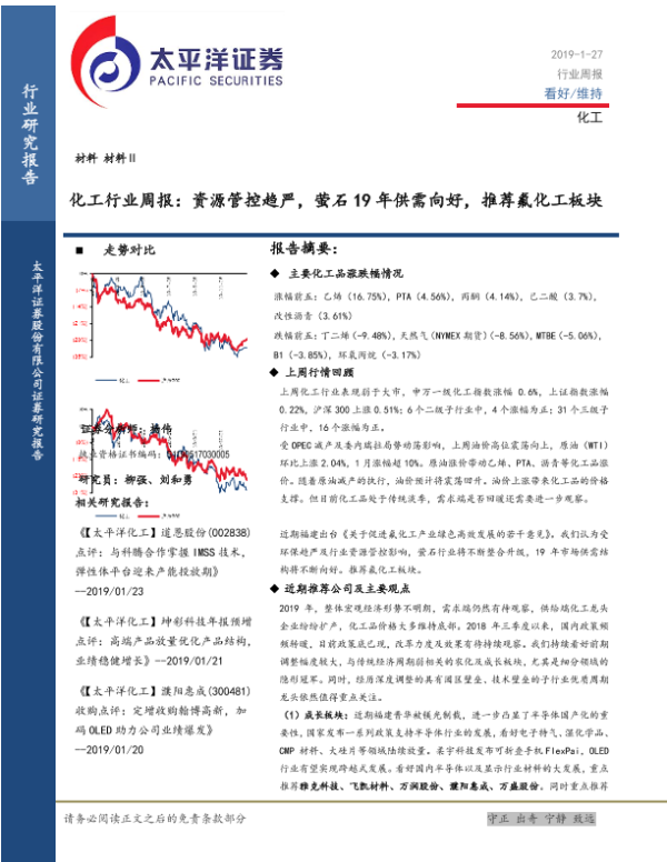 【太平洋证券】【20190127】化工行业周报:资源管控趋严,萤石19年供需向好,推荐氟化工板块-41页