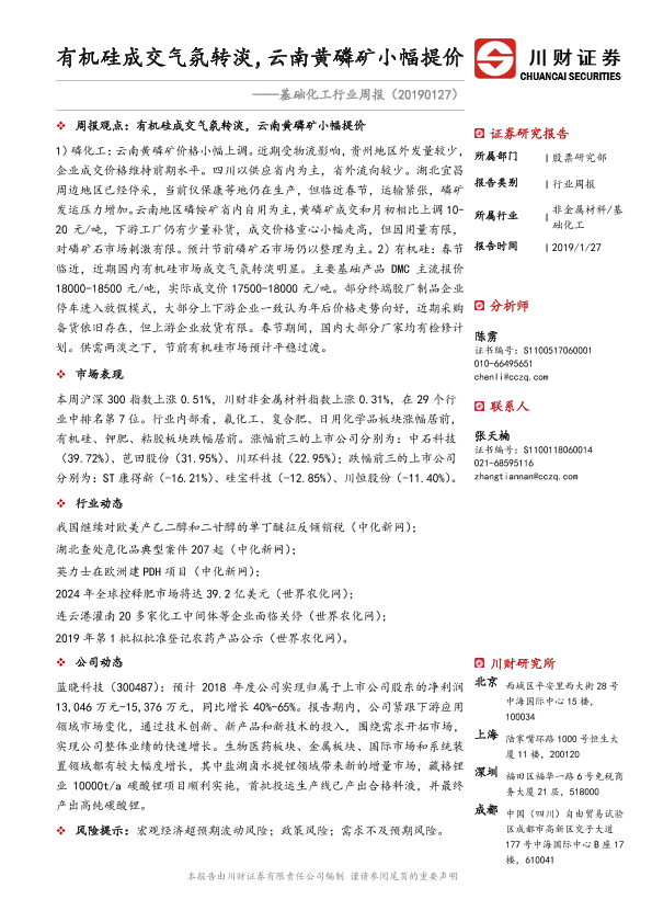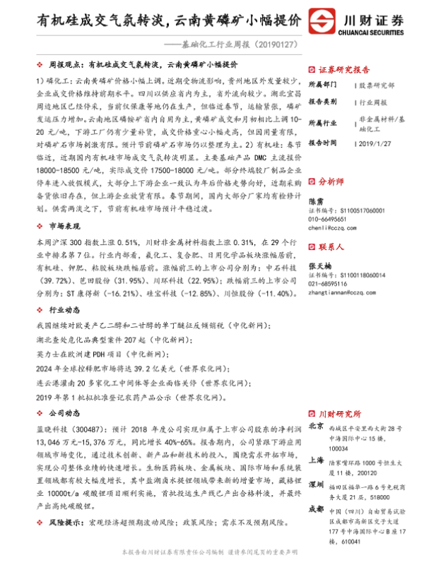 【川财证券】【20190127】基础化工行业周报:有机硅成交气氛转淡,云南黄磷矿小幅提价-21页