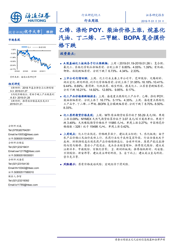 【海通证券】【20190131】20190131-海通证券-化工行业周报:乙烯、涤纶POY、柴油价格上涨,烷基化汽油、丁二烯、二甲醚、BOPA复合膜价格下跌-18页