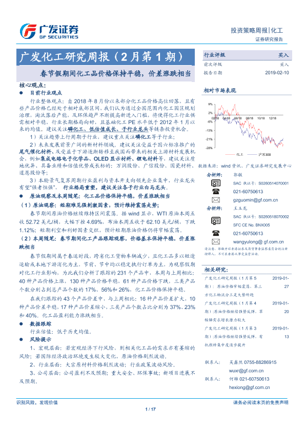 【广发证券】【20190210】广发化工研究周报(2月第1期):春节假期间化工品价格保持平稳,价差涨跌相当-17页