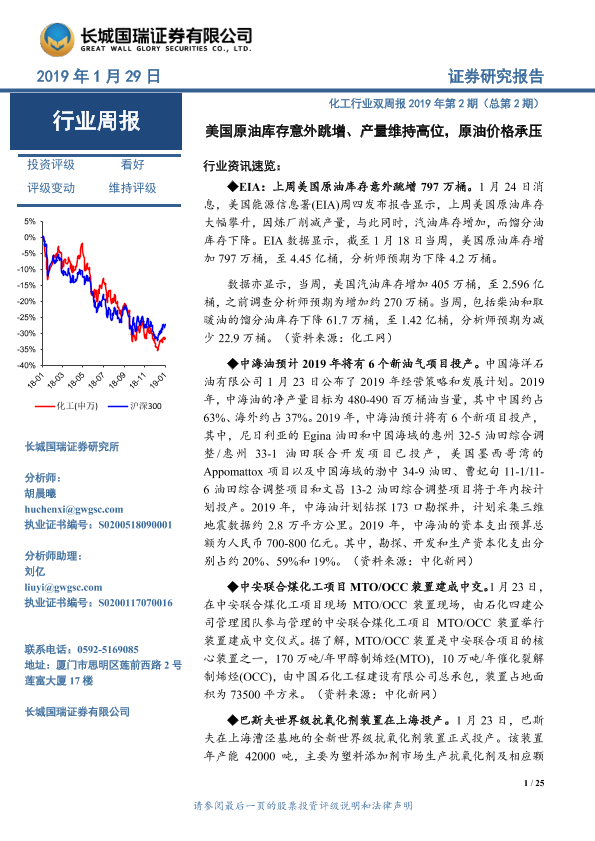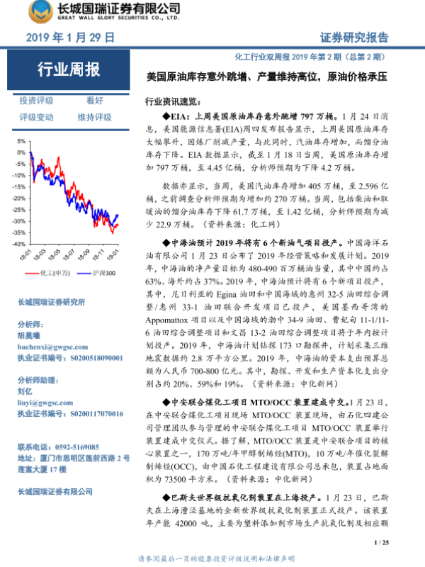 【长城国瑞证券】【20190129】化工行业双周报2019年第2期(总第2期):美国原油库存意外跳增、产量维持高位,原油价格承压-25页