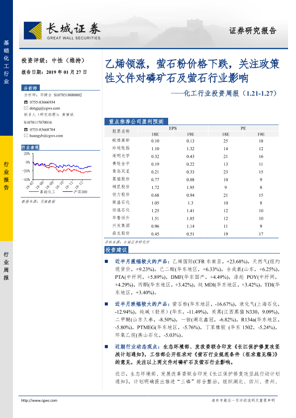【长城证券】【20190127】20190127-长城证券-化工行业投资周报:乙烯领涨,萤石粉价格下跌,关注政策性文件对磷矿石及萤石行业影响-39页