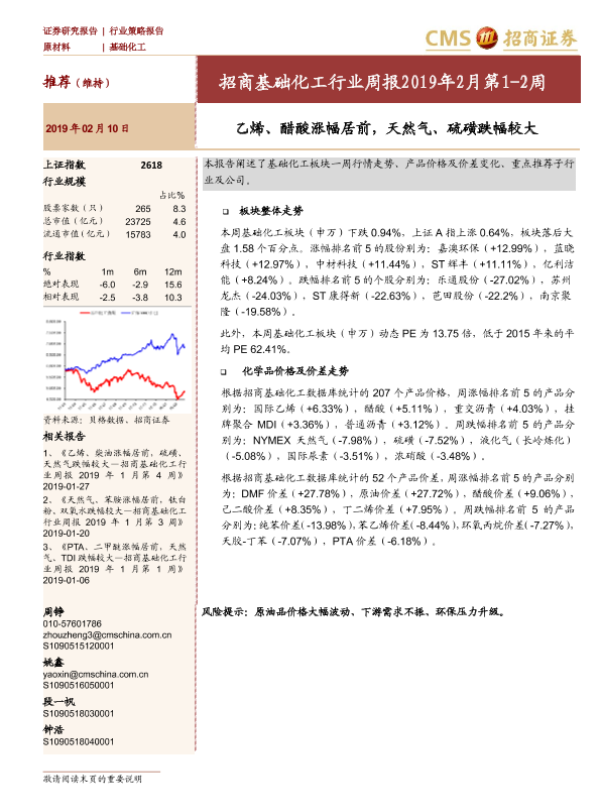 【海通证券】【20190210】招商基础化工行业周报2019年2月第1-2周:乙烯、醋酸涨幅居前,天然气、硫磺跌幅较大-20页
