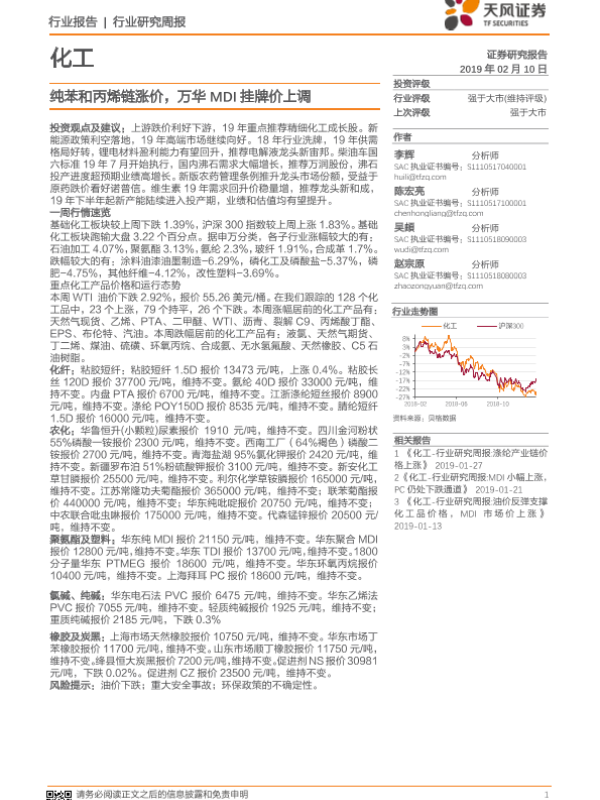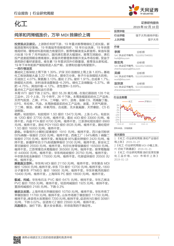 【天风证券】【20190210】20190210-天风证券-化工行业研究周报:纯苯和丙烯链涨价,万华MDI挂牌价上调-18页