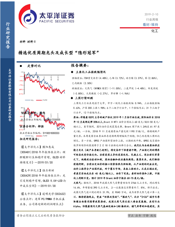 【太平洋证券】【20190210】20190210-太平洋-化工行业周报:精选优质周期龙头及成长型“隐形冠军”-40页