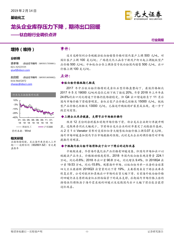 【光大证券】【20190214】钛白粉行业调价点评:龙头企业库存压力下降,期待出口回暖-5页