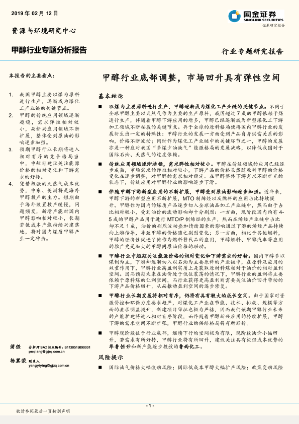 【国金证券】【20190212】甲醇行业专题分析报告:甲醇行业底部调整,市场回升具有弹性空间-20页