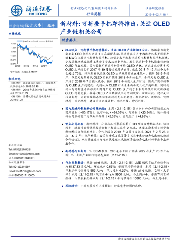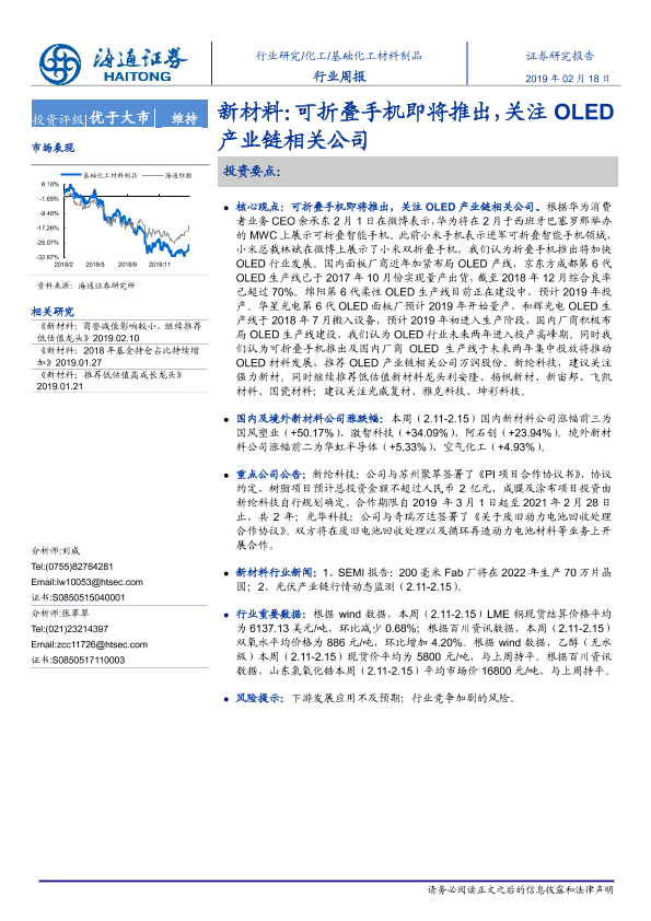 【海通证券】【20190218】基础化工材料制品行业周报:新材料:可折叠手机即将推出,关注OLED产业链相关公司-10页