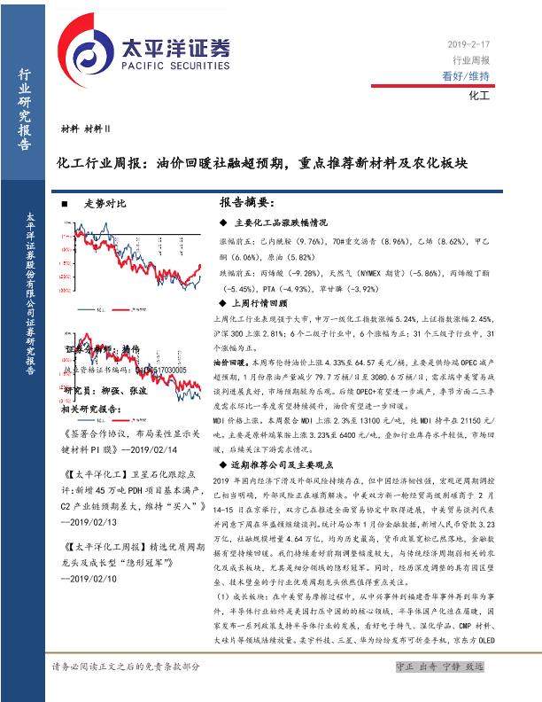 【太平洋证券】【20190217】20190217-太平洋-化工行业周报:油价回暖社融超预期,重点推荐新材料及农化板块-38页