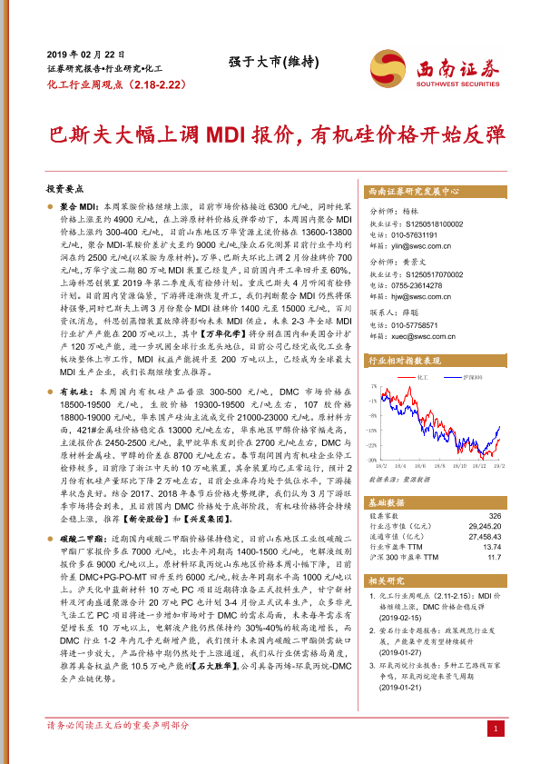 【西南证券】【20190222】20190222-西南证券-化工行业周观点:巴斯夫大幅上调MDI报价,有机硅价格开始反弹-4页