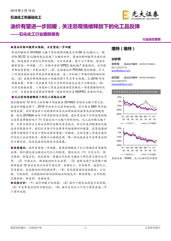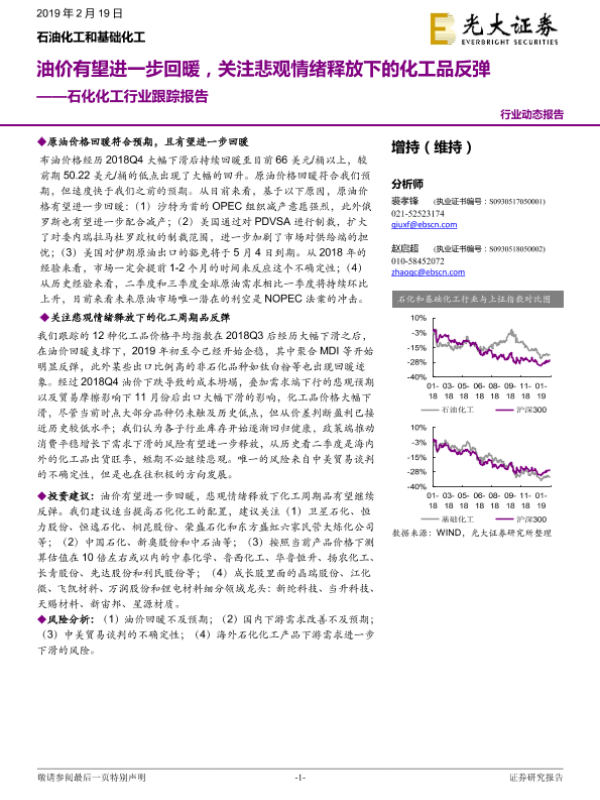【光大证券】【20190219】石化化工行业跟踪报告:油价有望进一步回暖,关注悲观情绪释放下的化工品反弹-11页
