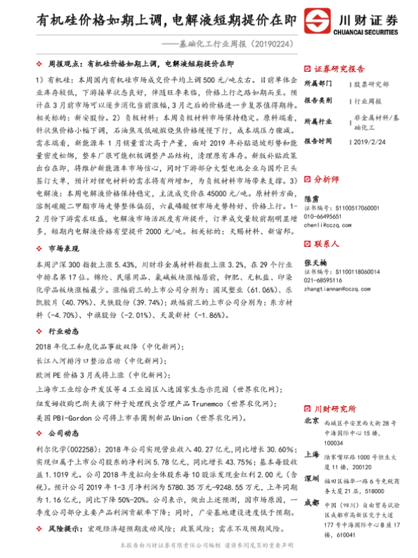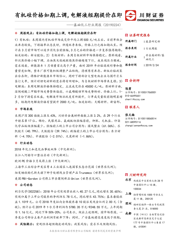 【川财证券】【20190224】基础化工行业周报:有机硅价格如期上调,电解液短期提价在即-22页