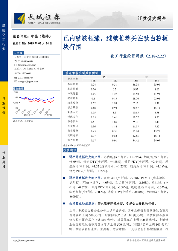 【长城证券】【20190224】20190224-长城证券-化工行业投资周报:己内酰胺领涨,继续推荐关注钛白粉板块行情-37页