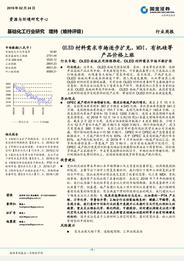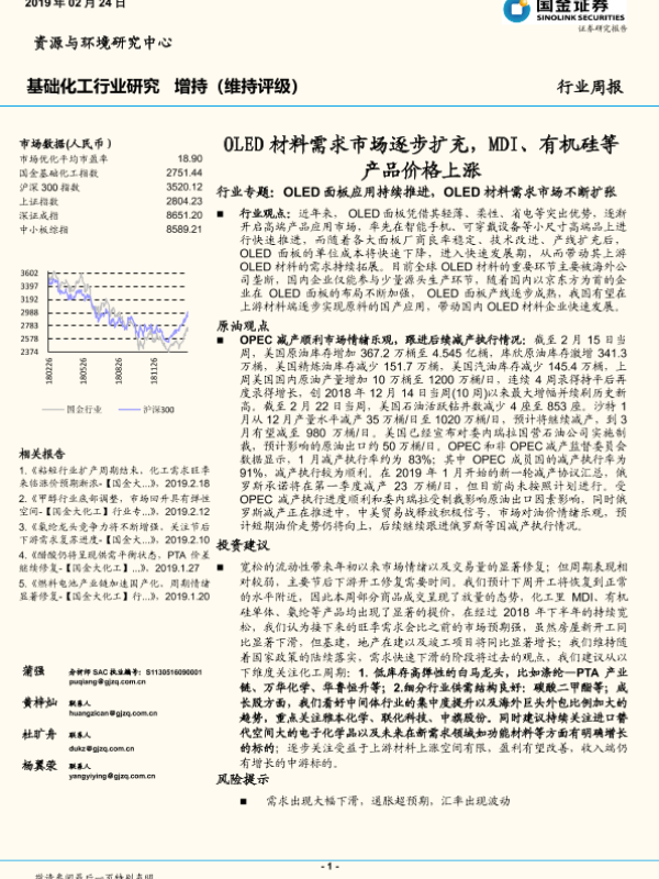 【国金证券】【20190224】基础化工行业研究:OLED材料需求市场逐步扩充,MDI、有机硅等产品价格上涨-36页