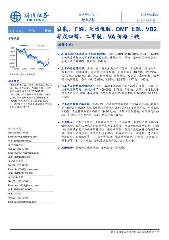 【海通证券】【20190225】20190225-海通证券-化工行业周报:液氯、丁酮、天然橡胶、DMF上涨,VB2、季戊四醇、二甲醚、VA价格下跌-18页