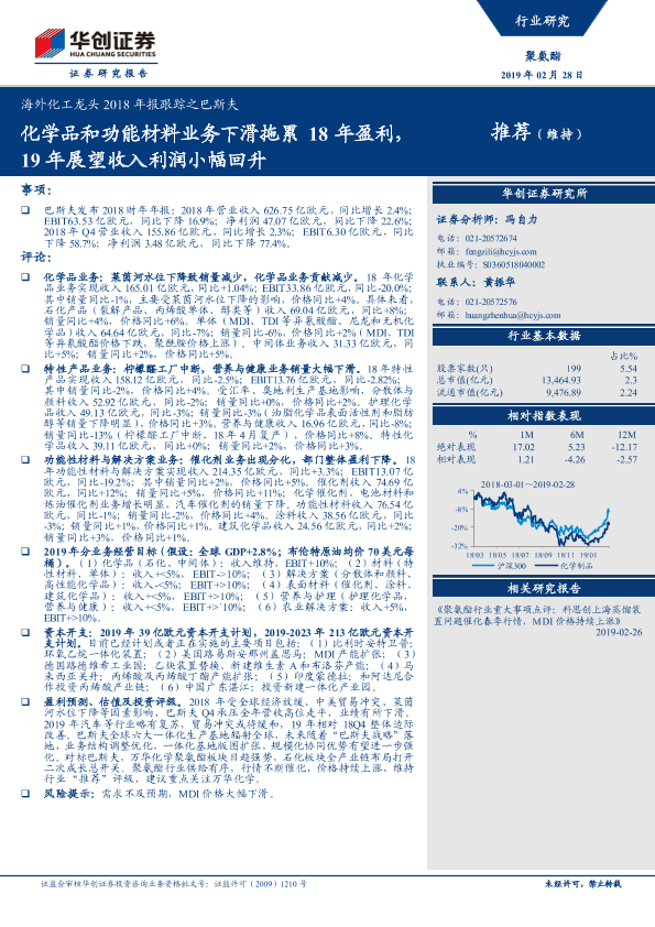 【华创证券】【20190228】海外化工龙头2018年报跟踪之巴斯夫:化学品和功能材料业务下滑拖累18年盈利,19年展望收入利润小幅回升-3页