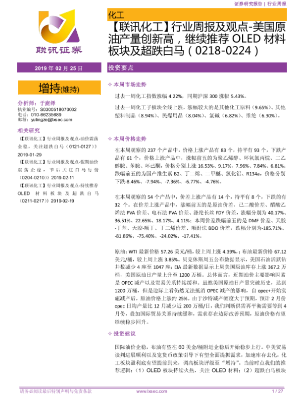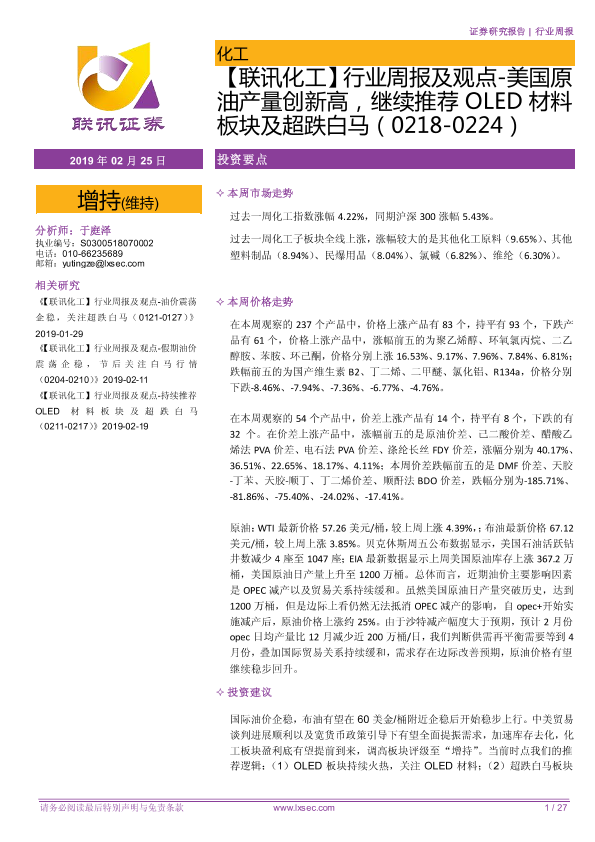 【粤开证券】【20190225】行业周报及观点-美国原油产量创新高,继续推荐OLED材料板块及超跌白马-27页