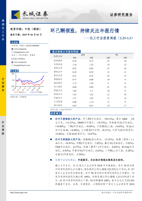 【长城证券】【20190303】20190303-长城证券-化工行业投资周报:环己酮领涨,持续关注年报行情-37页
