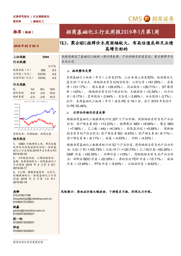 【海通证券】【20190303】基础化工行业周报2019年3月第1周:VK3、聚合MDI挂牌价本周涨幅较大,布局估值底部及业绩高增长标的-24页