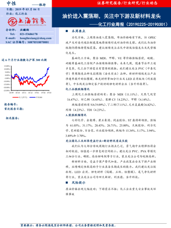 【上海证券】【20190304】20190304-上海证券-化工行业周报:油价进入震荡期,关注中下游及新材料龙头-16页