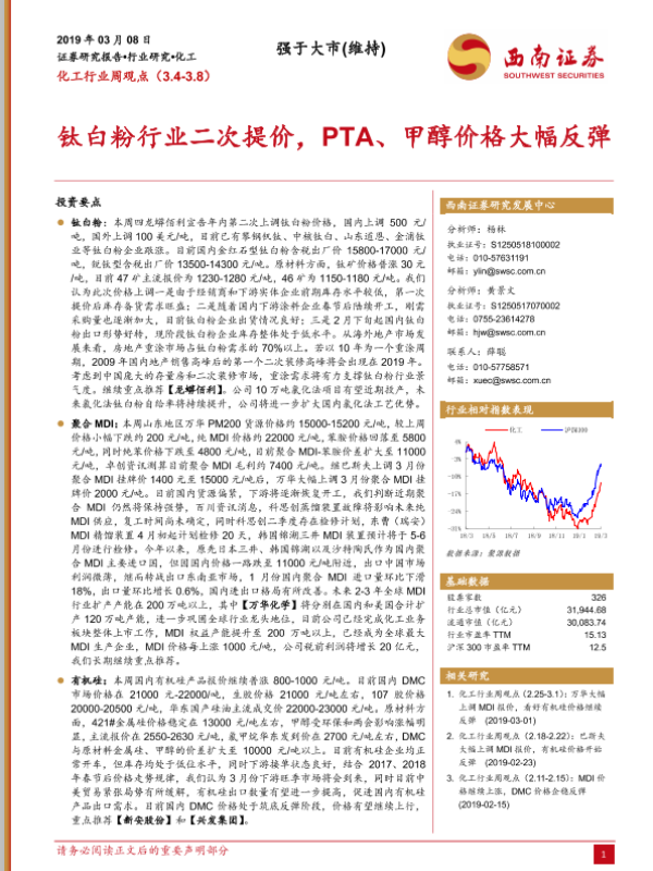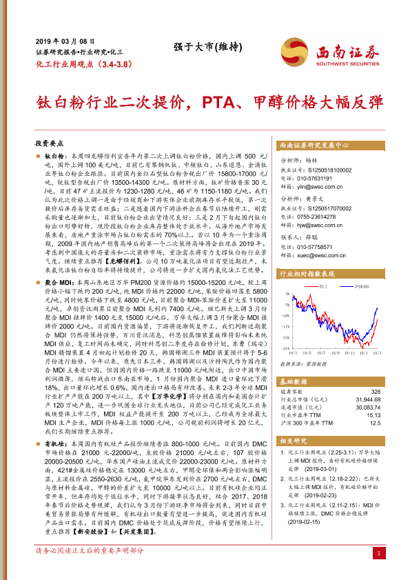 【西南证券】【20190308】20190308-西南证券-化工行业周观点:钛白粉行业二次提价,PTA、甲醇价格大幅反弹-4页