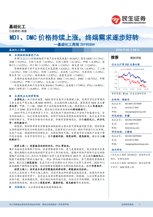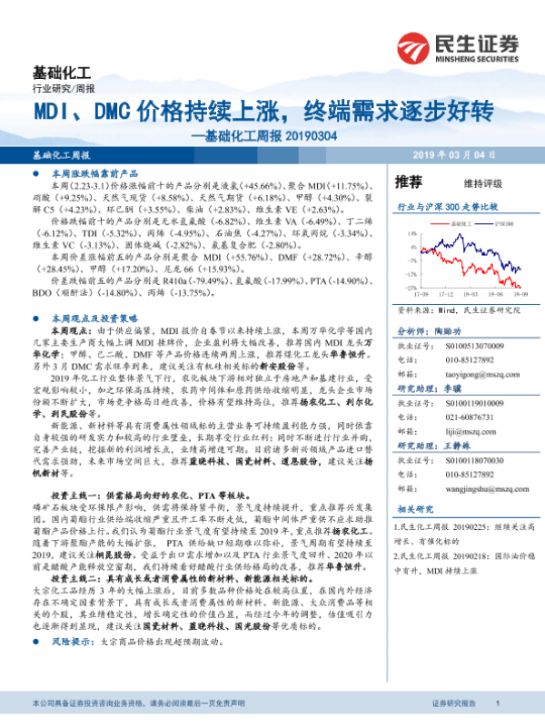 【民生证券】【20190304】基础化工周报:MDI、DMC价格持续上涨,终端需求逐步好转-30页