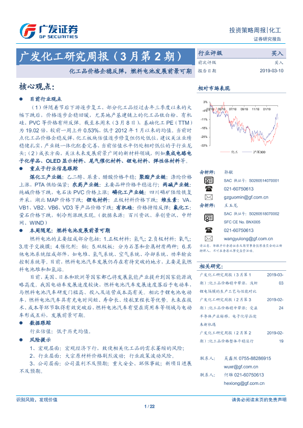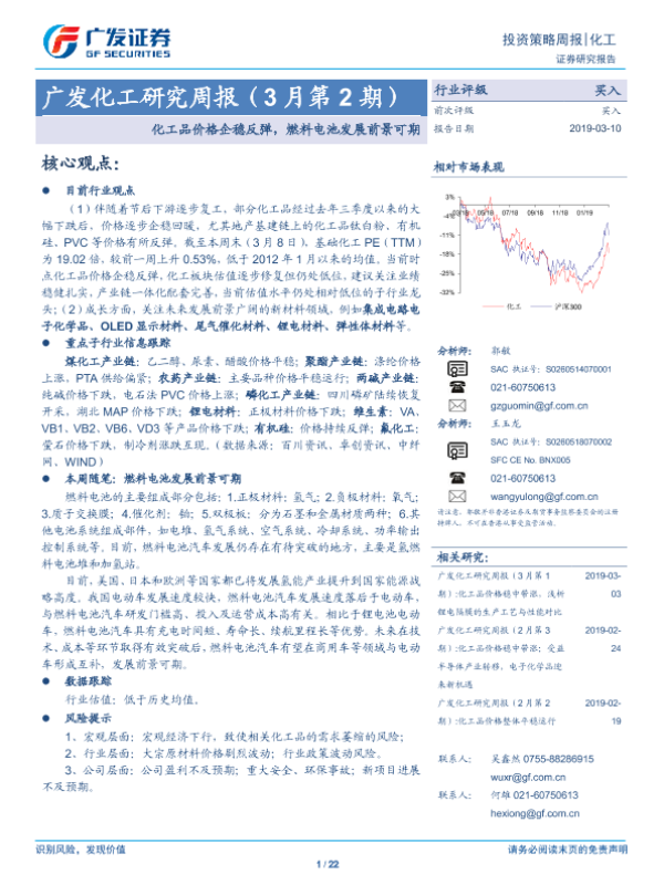 【广发证券】【20190310】广发化工研究周报(3月第2期):化工品价格企稳反弹,燃料电池发展前景可期-22页