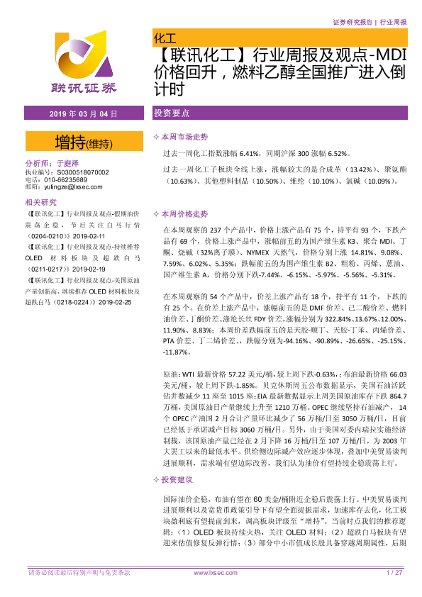 【粤开证券】【20190304】行业周报及观点:MDI价格回升,燃料乙醇全国推广进入倒计时-27页