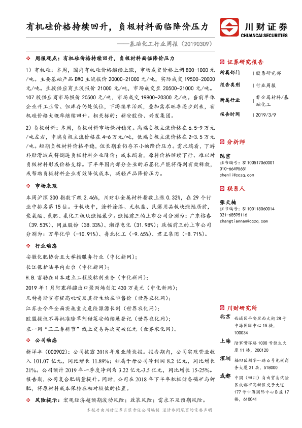 【川财证券】【20190309】基础化工行业周报:有机硅价格持续回升,负极材料面临降价压力-20页