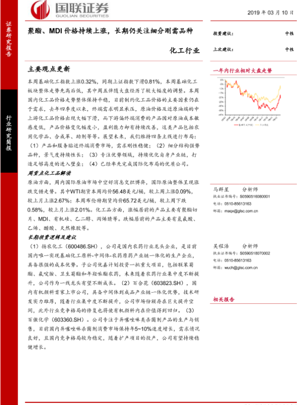 【国联证券】【20190310】化工行业:聚酯、MDI价格持续上涨,长期仍关注细分刚需品种-17页