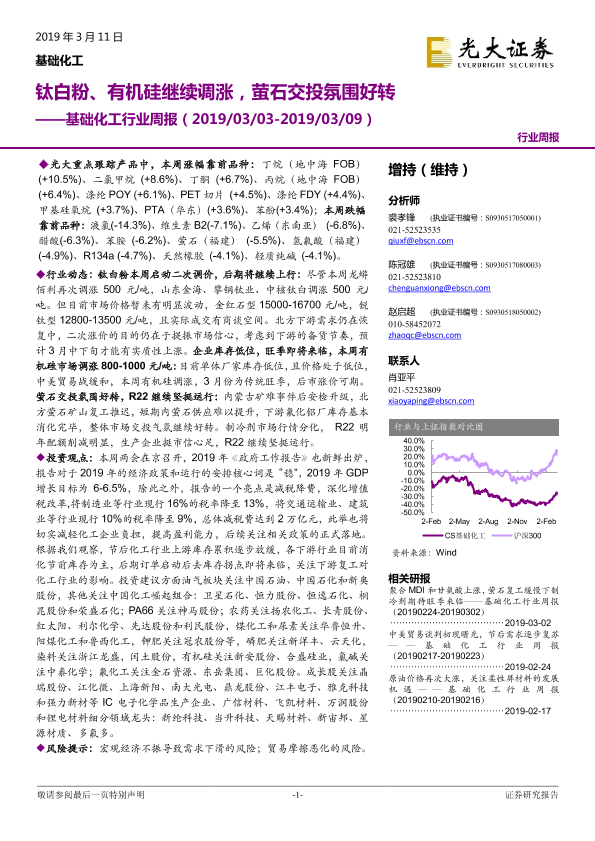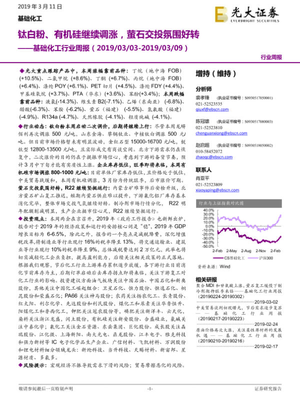 【光大证券】【20190311】基础化工行业周报:钛白粉、有机硅继续调涨,萤石交投氛围好转-20页
