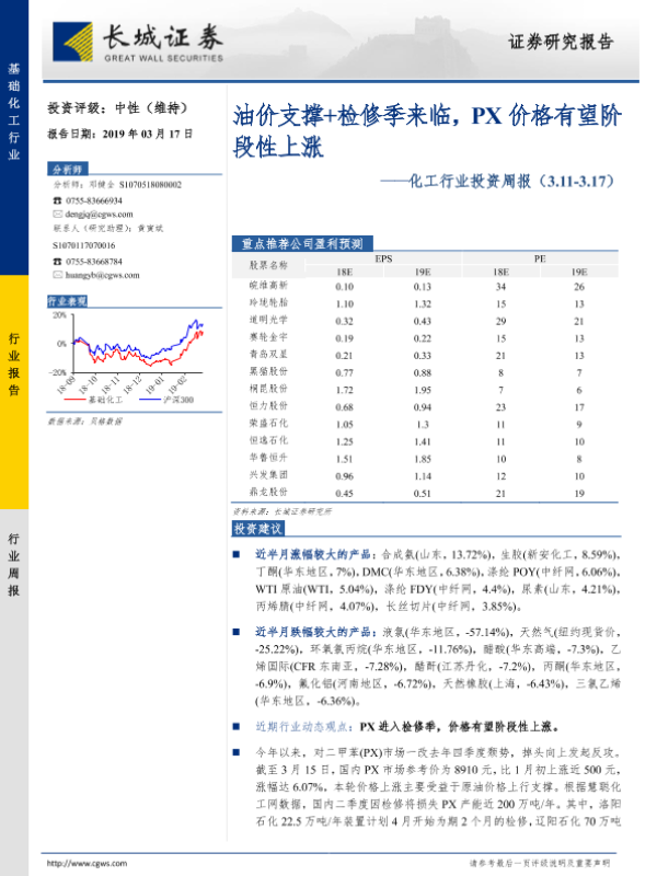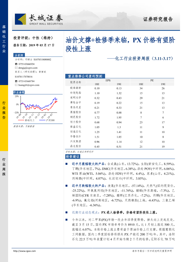 【长城证券】【20190317】20190317-长城证券-化工行业投资周报:油价支撑+检修季来临,PX价格有望阶段性上涨-38页