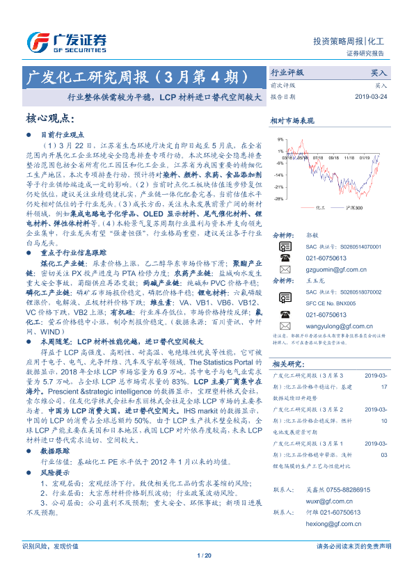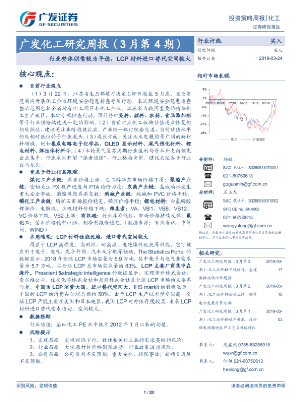 【广发证券】【20190324】广发化工研究周报(3月第4期):行业整体供需较为平稳,LCP材料进口替代空间较大-20页