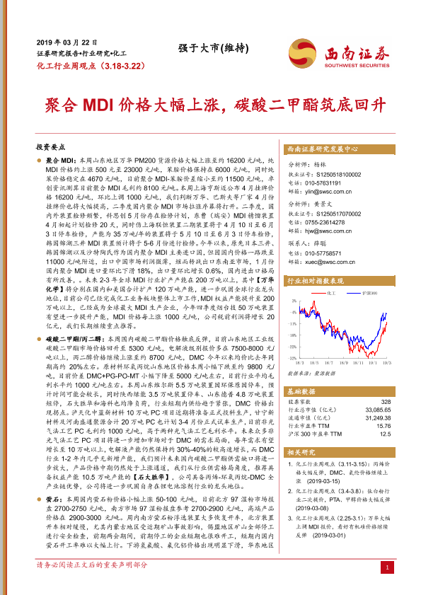 【西南证券】【20190322】20190322-西南证券-化工行业周观点:聚合MDI价格大幅上涨,碳酸二甲酯筑底回升-4页
