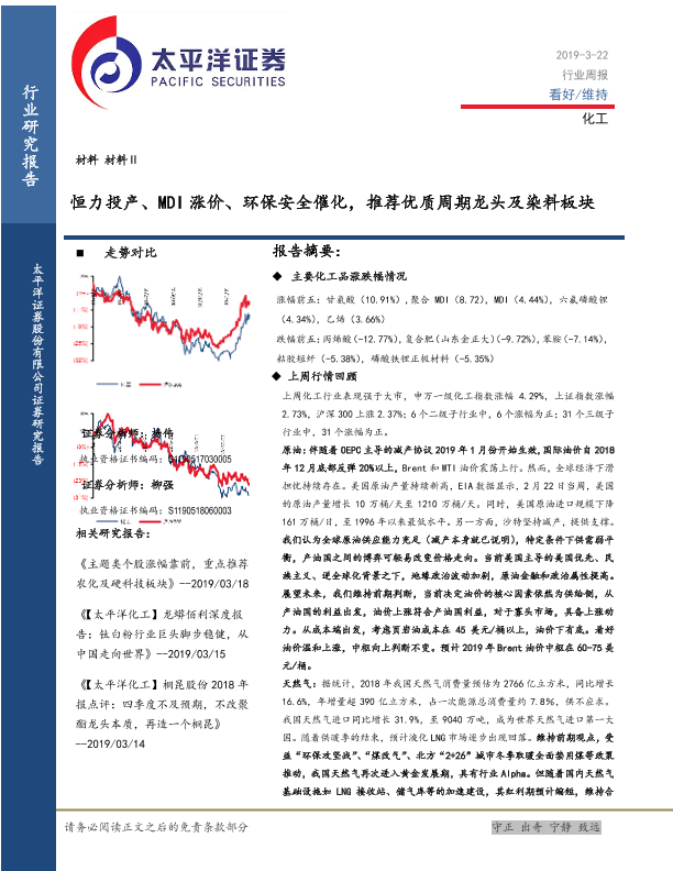 【太平洋证券】【20190322】20190322-太平洋-化工行业周报:恒力投产、MDI涨价、环保安全催化,推荐优质周期龙头及染料板块-41页