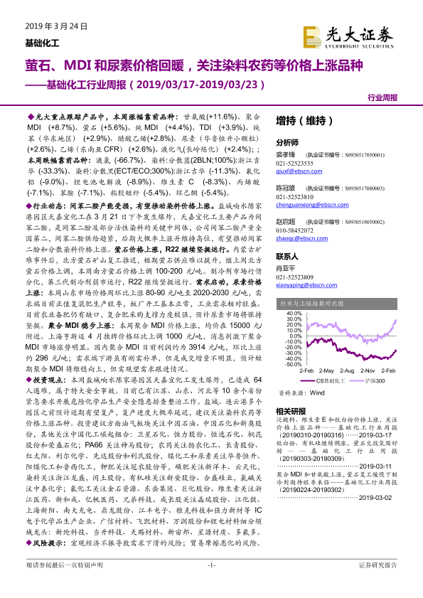【光大证券】【20190324】基础化工行业周报:萤石、MDI和尿素价格回暖,关注染料农药等价格上涨品种-19页