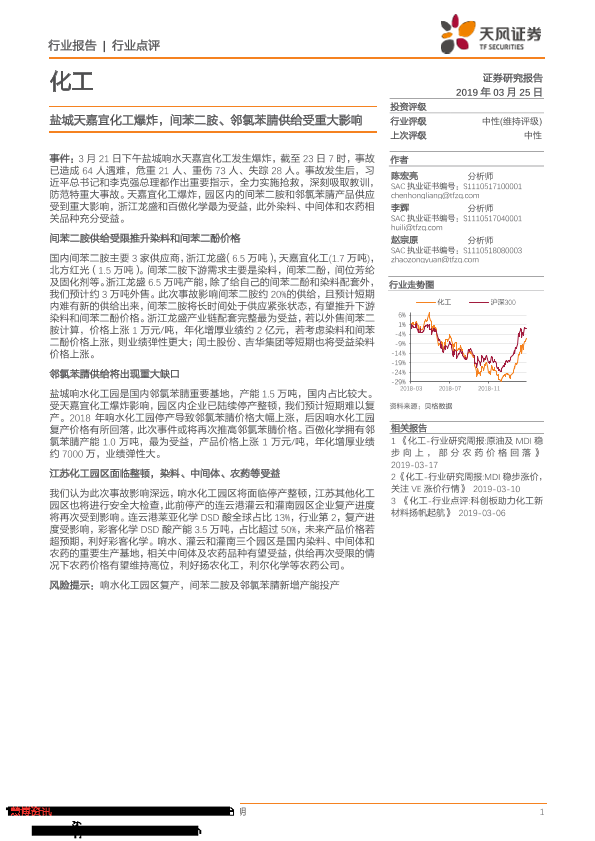 【天风证券】【20190325】化工行业点评:盐城天嘉宜化工爆炸,间苯二胺、邻氯苯腈供给受重大影响-4页